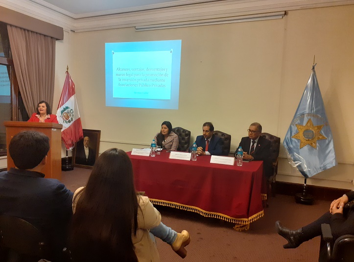 El día 11 de Junio de 2019, se llevó a cabo en la Sala García Calderón del Colegio de Abogados de Lima, la Conferencia “Las Asociaciones Público Privadas: Desafíos, Ventajas y Desventajas” organizada por la Comisión de Estudio de Derecho Comercial y Comercio Internacional del C.A.L, la cual tuvo como ponentes a la Dra. Vanessa Juarez Morales, Supervisora en la Gerencia de Control de Asociaciones Público Privadas y Obras por Impuestos de la Contraloría General de la República, quien trató el tema “Alcances, Ventajas, Desventajas y Marco Legal para la Promoción de la Inversión Privada mediante las Asociaciones Público Privadas”.