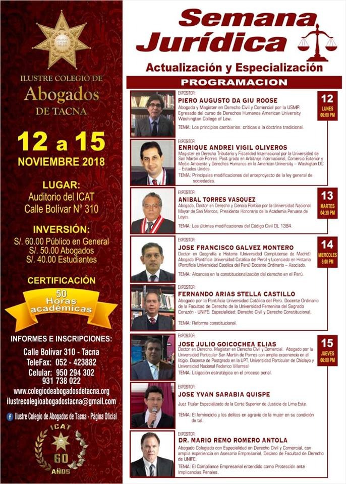 El 12 de noviembre de 2018, se llevó a cabo en el Ilustre Colegio de Abogado de Tacna por el sesenta aniversario de la orden, la Semana Jurídica, donde nuestro socio fundador Enrique Vigil Oliveros tuvo como ponencia las Principales reformas a la Ley General de Sociedades a propósito del Anteproyecto.