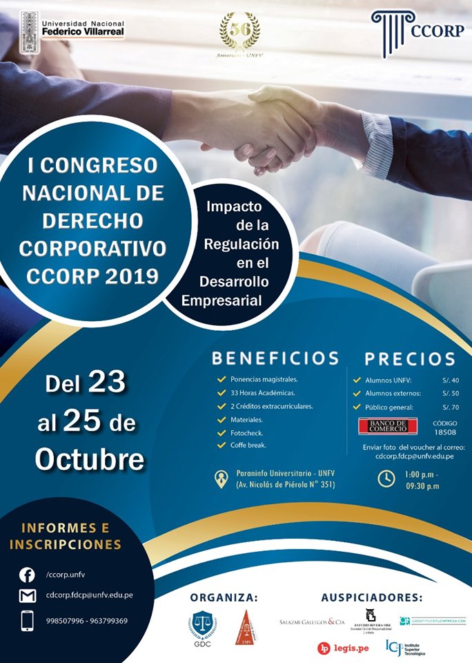 El 21 de octubre de 2019 comenzó El I Congreso Nacional de Derecho Corporativo - CCORP, organizado por los docentes y estudiantes de la Facultad de Derecho y Ciencia Política de la Universidad Nacional Federico Villarreal, tiene el agrado de presentar a la comunidad jurídica en general, la publicidad oficial de este magno evento, el mismo que será realizado en el marco de las actividades académicas por el 56° Aniversario de nuestra casa de estudios superiores.