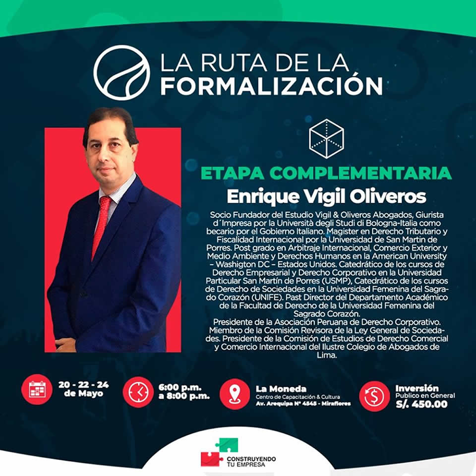 El 19 de diciembre de 2018 nuestro socio Enrique Vigil Oliveros fue convocado por la Escuela Jurídica al seminario taller: Actualización de normas jurídicas. Régimen societario: Decreto Legislativo N° 1409 (SACS) y Decreto Legislativo N° 1427.